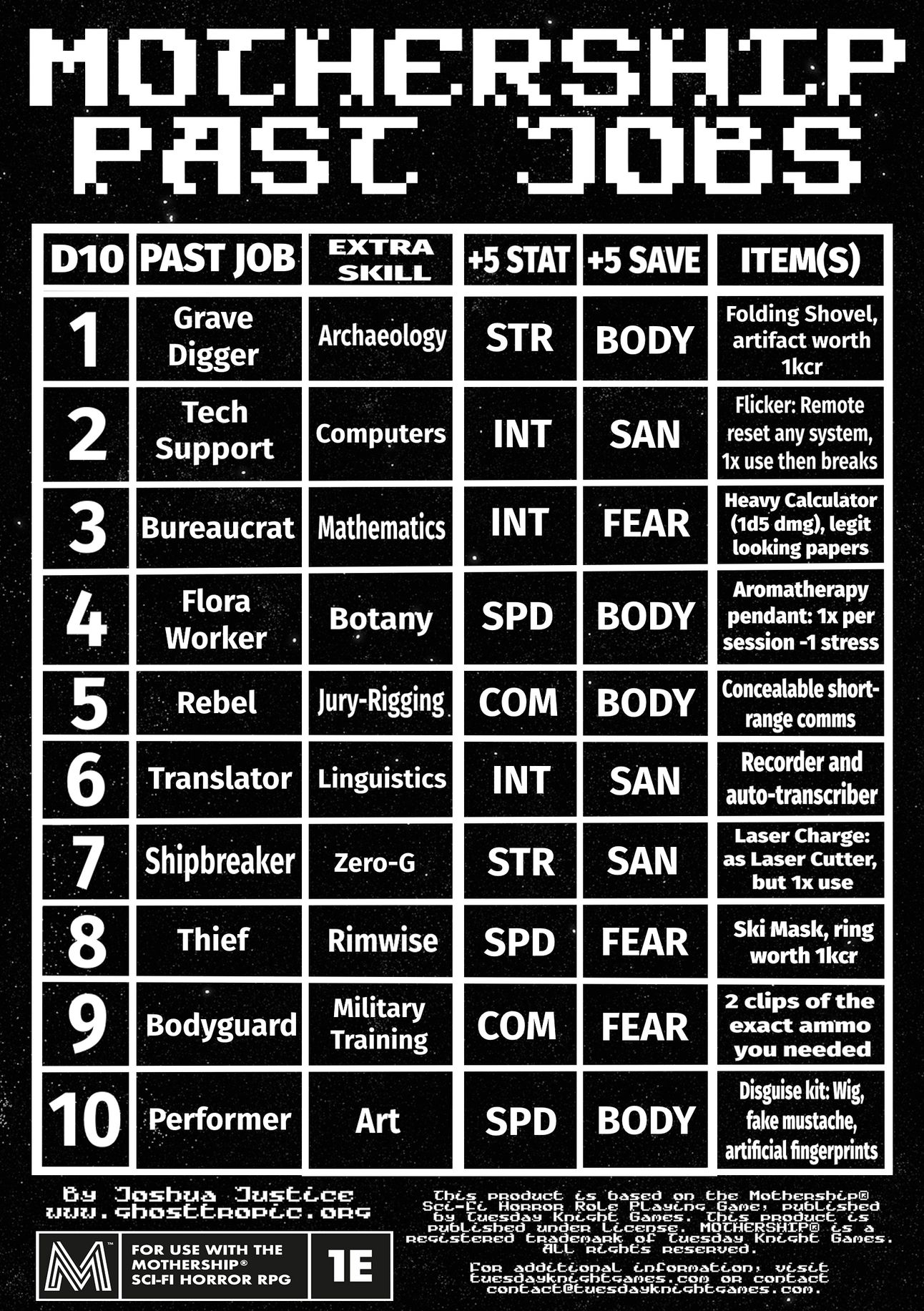 I’ve been at work on a set of Mothership past job and background tables based on those in Ruination Pilgrimage (with Donn’s blessing, don’t worry!). The backgrounds are still coming along, but I’m fairly satisfied with the past job table. Each convey an item, bonus skill, +5 to a stat and +5 to save. The idea is to make characters a bit more unique, as well as toughen them up a bit for longer campaigns.